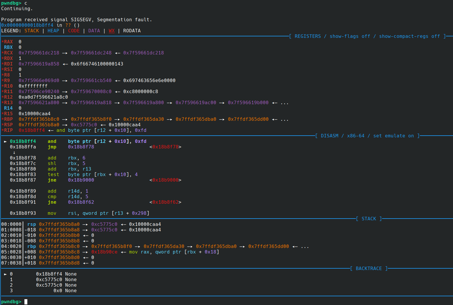 经过一步一步调试,发现之前崩溃的 R12 是在这个函数栈帧返回后的好几个栈帧才被 pop 进 R12 的,然后强制解引用非法指针导致崩溃。